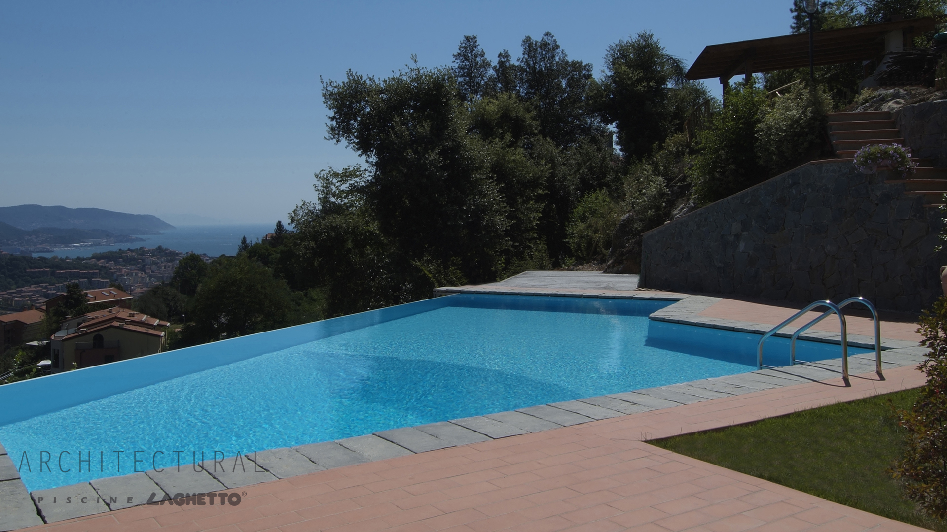 Unisce i vantaggi della struttura modulare di facile trasporto e montaggio, con pochissimo impatto ambientale grazie a un cantiere che necessita di opere murarie limitate e quindi tempi brevi di installazione, alla capacità di esaudire ogni richiesta estetica, in ambientazioni particolari e suggestive, con scale romane e lati a cascata a sfioro infinito. Il sistema a sfioro, con canale di tracimazione coperto dalla pavimentazione perimetrale, genera l’effetto architettonico di vedere un pavimento di acqua incorniciato dal bordo in pietra della piscina.